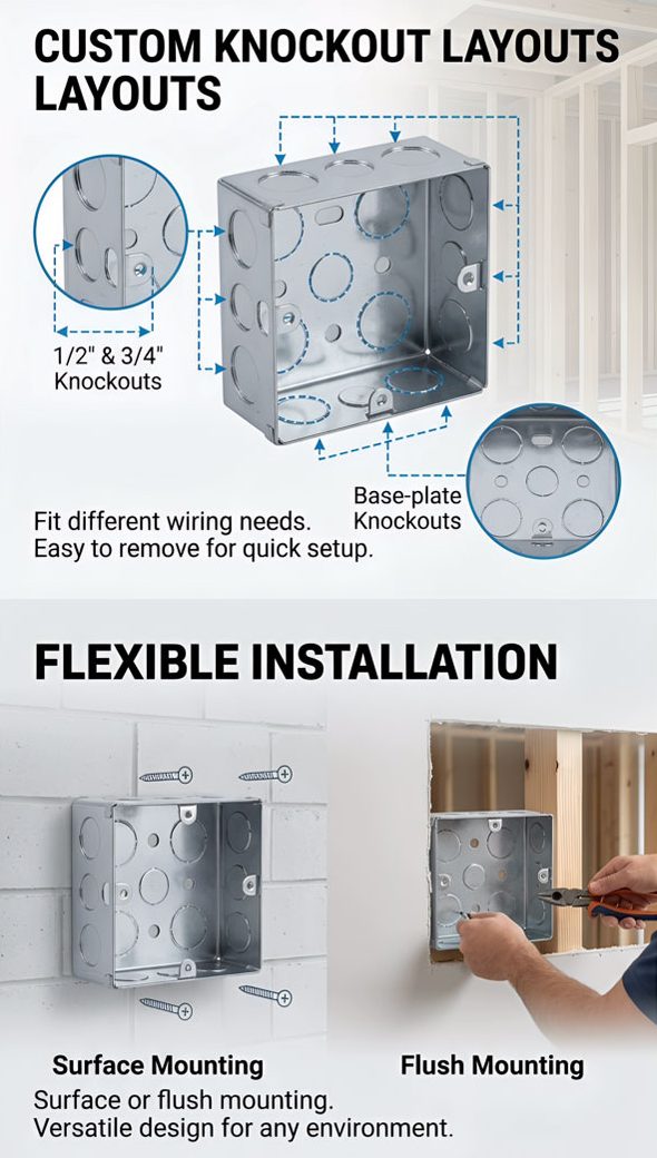 With support for common formats such as 3″x3″, 4 square, and 1–4 gang options, this product offers a reliable solution for customers who need a standard box range with room for project-based customization.
